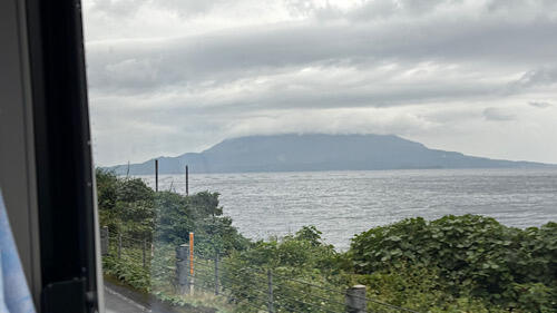 B団も鹿児島中央駅に無事に到着し、バスに乗り換えて民泊先である垂水市まで移動中です。 だだ、鹿児島は秋雨前線の影響で雨です。桜島も頂上付近は雲に隠れてしまってます。