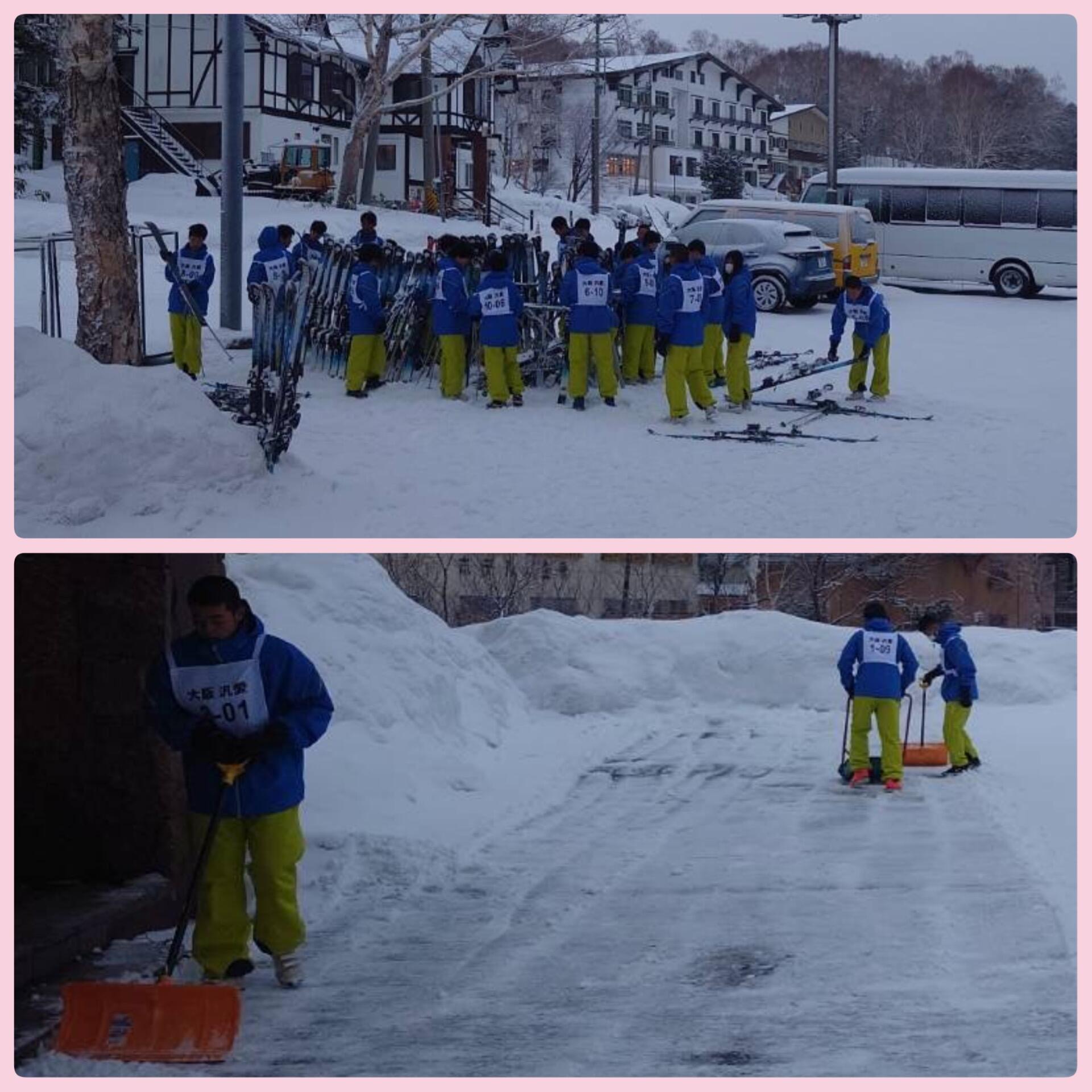 おはようございます。 実習4日目。本日は雪かきと用具点検ののち朝礼をしました。 クラスごとに集合写真もとりました。今日も1日しっかり滑りましょう。