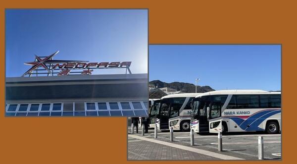 静岡駅からはバスに乗り換えて昼食会場まで移動します。途中清水PAで休憩です。山の間から富士山を見ることができました。