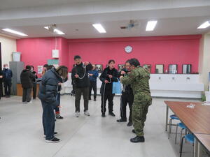 消火訓練は防災アドバイザーの指導のもと水消火器による消火体験を実施し、ロープワーク実習は自衛隊員による発災直後の自衛隊の活動内容や災害時のみならず日常生活でも活用できる基本の結び方(本結び、もやい結び)を実践形式で学びました。