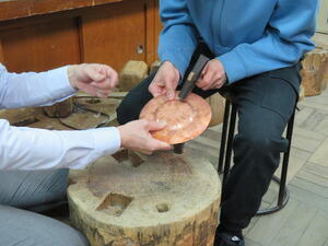 3年クラフト系列の工芸実習Ⅰの授業では鍛金技法について学んでいます。 金槌と当て金と呼ばれる道具を使い、一枚の銅板から立体的に造形していきます。 今年度は鍛金技法でマグカップの制作に取り組んでおり、今から完成が楽しみです!