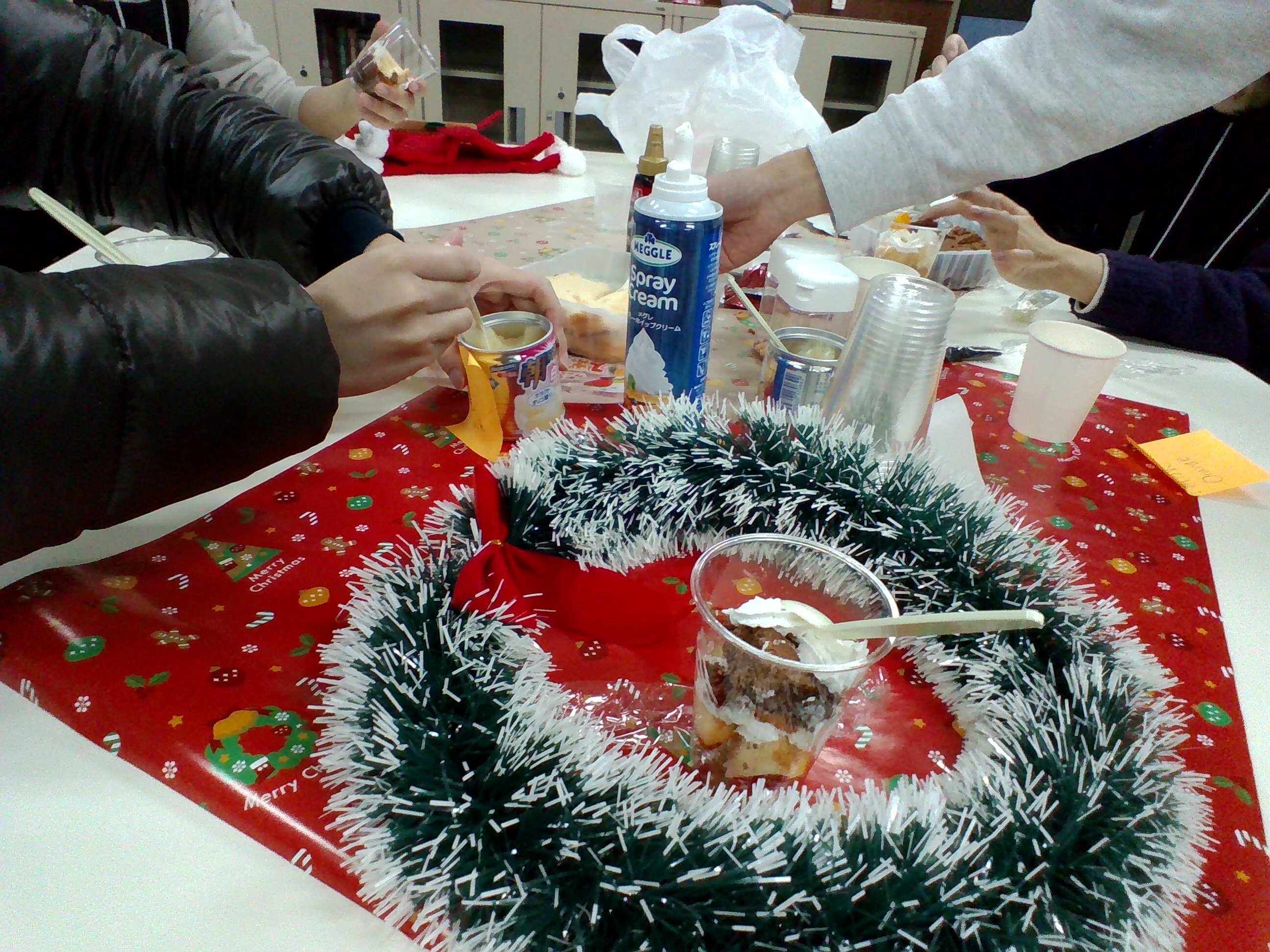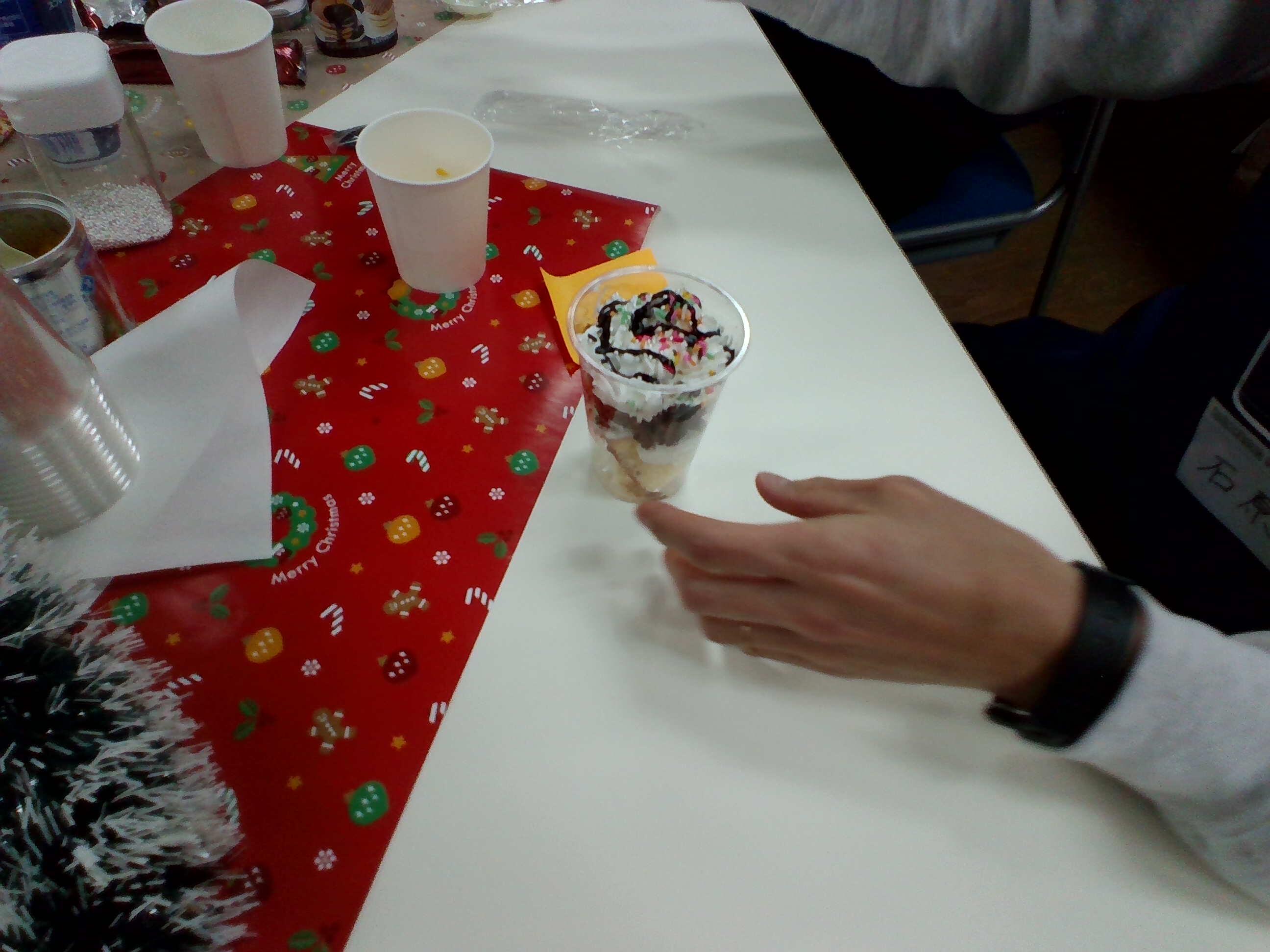 今回のパーティーのハイライトの一つは、パフェ作り! スポンジケーキにクリーム、チョコレートソースなどのトッピングを自由に組み合わせて、オリジナルのクリスマスパフェを創作しました。