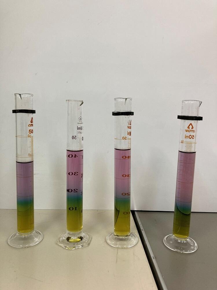 まず、さまざまなpH指示薬の色の変化を確認し、その後pH万能試験紙を使って牛乳・レモン汁・石けん水などの身近な物質のpHを調べました。さらに、紫キャベツ・ブルーベリーなどに含まれる「アントシアニン」という色素を使って酸性から塩基性(アルカリ性)までの色の変化(メスシリンダーの写真)を確認しました。「アントシアニン」の色の変化は、知育菓子にも利用されています。