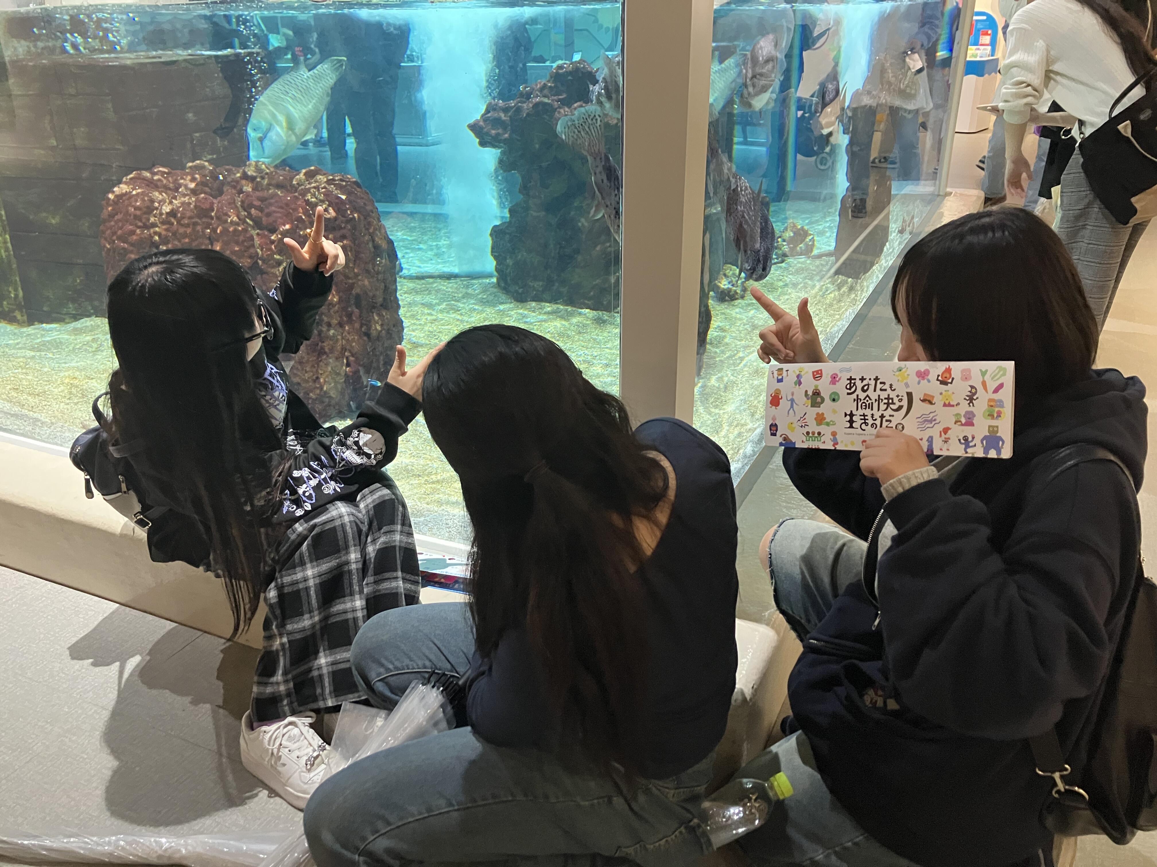 1は、『いろにふれる』(あか、あお、きいろ、色鮮やかな魚たちが泳ぐゆるやかに「いろ」が変化する世界を体験できる)。2は、『わざにふれる』(水を噴く、砂に隠れる、まわりと同じ色に変化する生き物たちのオリジナリティあふれる「わざ」を体験できる)。3は、『およぎにふれる』(魚たちが泳ぐ影と水の波紋が重なるアースティックな空間を体験できる)。4は、『ワンダーモーメンツ』(宇宙から星を眺めるような神秘的な空間アート体験ができる)。5は、『かくれるにふれる』(自然を生き抜くための「かくれる」能力を生き物の模様をモチーフにした空間を体感できる)。6は、『みずべにふれる』(「みずへ」に棲む大型動物たちが大迫力で迎え開放的な空間で驚きと感動の体験ができる)。7は、『うごきにふれる』(自然界のように生き物たちがのびのびと暮らすシェアハウスを見ることができる)。8は、『つながりにふれる』(多様な生き物との「つながり」をみつけるオリジナル映像を見ることができる)。と、盛り沢山でした。生徒たちは、一つ目のゾーンからじっくり「ふれる」を味わって、あっという間に集合時間となってました。