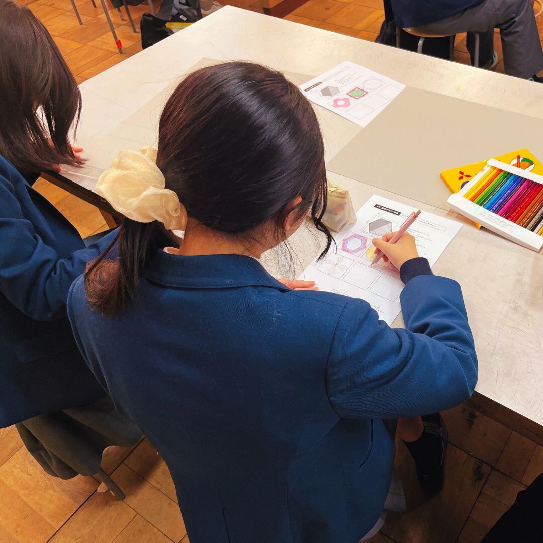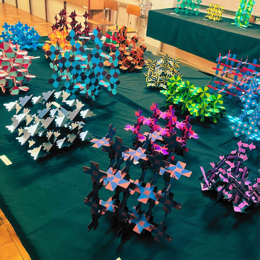 1年インテリアデザイン科「基礎デザイン」の授業では、空間設計にかかわる基礎的な課題に取り組みます。「ビルダーカード」は同じ形・色のユニットを50枚制作し組み立てて立体作品をつくる課題です。
