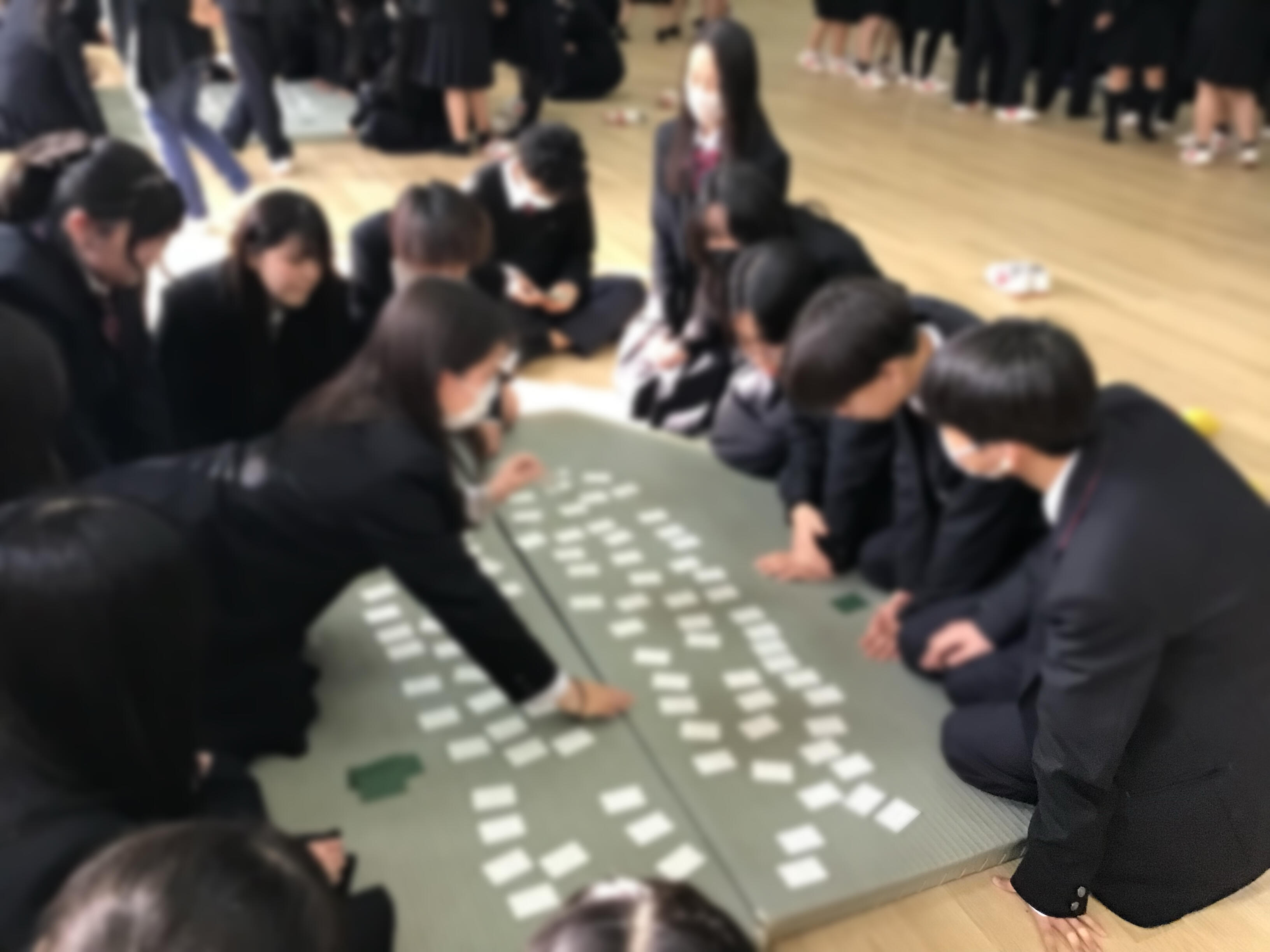 班ごとに協力しながら、どの札を狙うか相談したり、友だちを応援したりと、学年全体で盛り上がる時間となりました。 最後には成績発表もあり、1位1組B班、2位5組A班、3位5組B班でした。生徒たちにとって良い思い出になったようです。